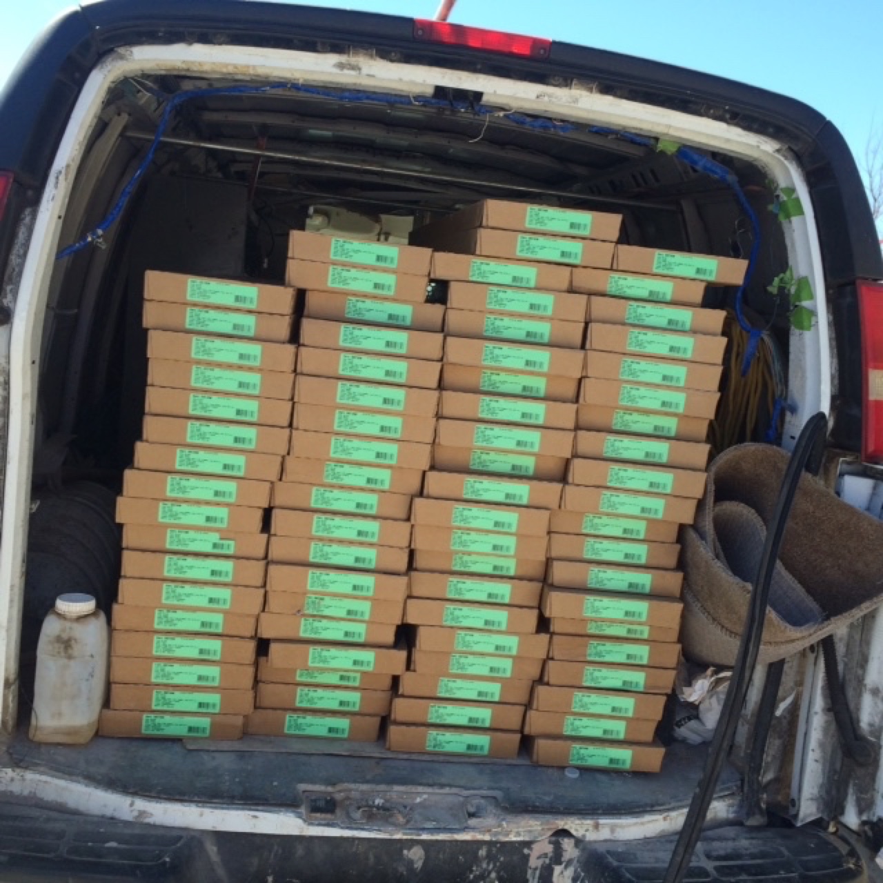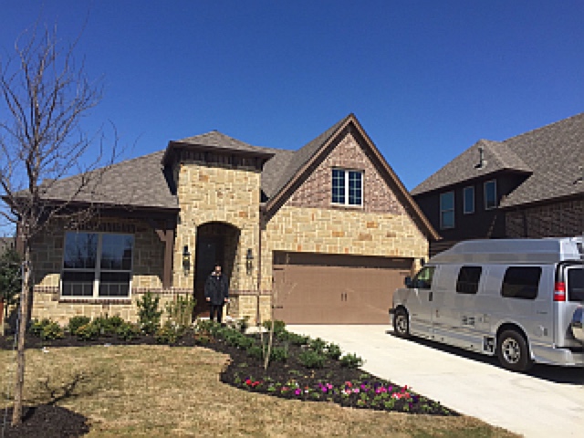 Kenna and Shammah and travel van in front of new home.